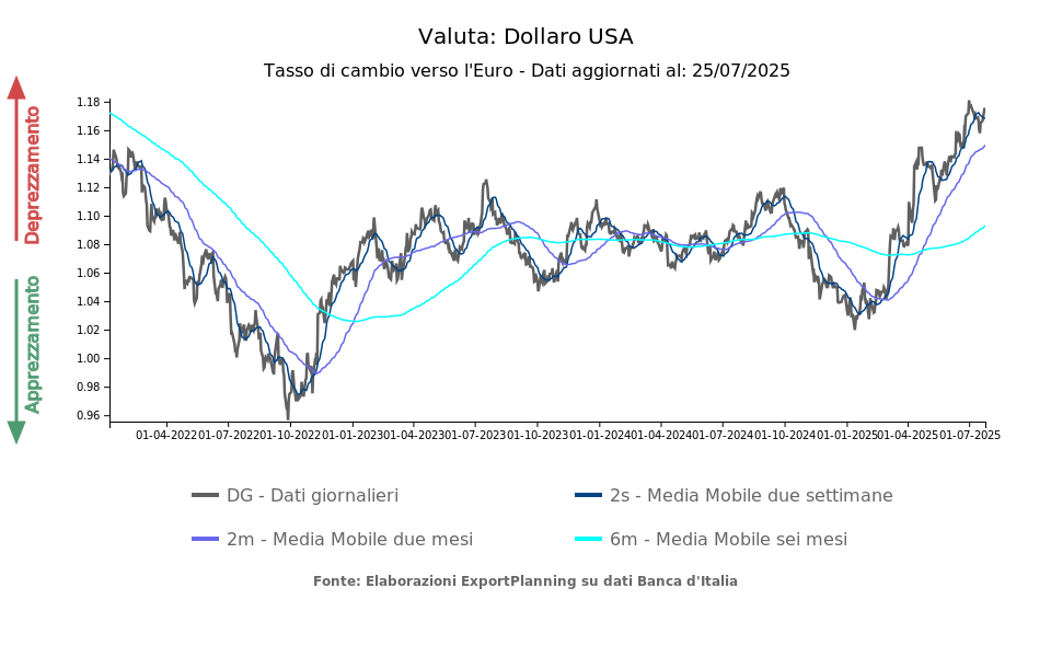 La svalutazione del dollaro rispetto all'euro rende ancora più cari i beni venduti dall’UE sul mercato degli Stati Uniti, sommandosi all’azione delle tariffe. Essa agisce, infatti, come un “dazio aggiuntivo implicito” ponendo un ulteriore fattore di ombra sull’intesa tra le due sponde dell’Atlantico. Va tuttavia segnalato come il cambio del dollaro/euro sia oggetto di molta attenzione da parte delle Banca Centrale Europea, che probabilmente in questa fase persegue l'obiettivo di limitare l'apprezzamento dell'euro.