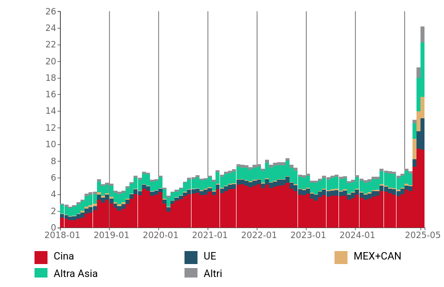 Tale disciplina “specifica” per partner commerciale, si affianca inoltre ai provvedimenti che hanno interessato settori specifici, quali i dazi re-introdotti da marzo 2025 su acciaio e alluminio – con aliquote tariffarie oggi pari al 50% - e quelli in vigore da aprile sulla filiera automotive pari al 25%.