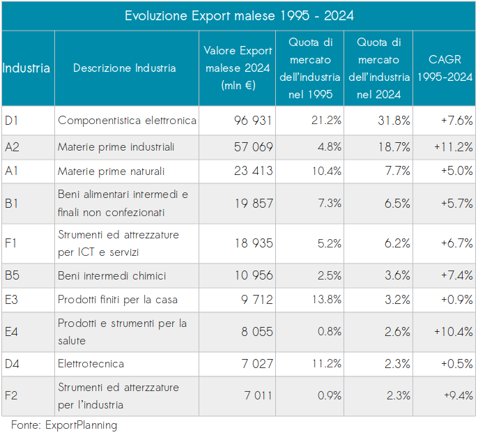 L’export malese ha subito nel tempo una profonda trasformazione, con un peso crescente delle componenti elettroniche e delle materie prime industriali e naturali a carattere energetico. Dalla tabella sottostante emerge chiaramente come la struttura delle esportazioni sia cambiata in modo significativo tra il 1995 e il 2024. La quota della componentistica elettronica, ad esempio, è passata dal 21.2% al 31.8% del totale, confermandosi il principale motore dell’export nazionale. Ancora più marcato l’aumento delle materie prime industriali, salite dal 4.8% al 18.7% nello stesso periodo.