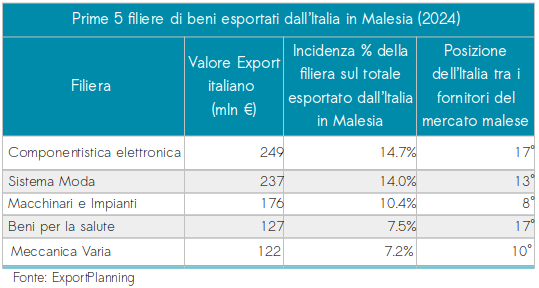 Le principali filiere in cui l’Italia esporta verso la Malesia includono componentistica elettronica, sistema moda, macchinari e impianti, beni per la salute e meccanica varia, settori ad alto valore aggiunto e ad elevato contenuto tecnologico.