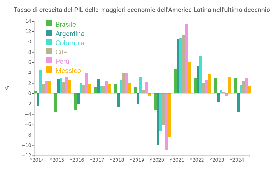 Negli anni a seguire, l’effetto combinato di instabilità economica e politiche inefficienti ha ostacolato lo sviluppo del paese: nell'ultimo mezzo secolo, il tasso di crescita medio annuo del PIL è stato di appena l'1.8%, ben al di sotto della media latino-americana del 3.2%. Come si nota dal grafico di seguito, che riporta il tasso di crescita del PIL dei maggiori paesi dell’America Latina nell’arco dell’ultimo decennio, la crescita argentina si è spesso collocata sotto la media della regione, nonché ripetutamente in territorio negativo.