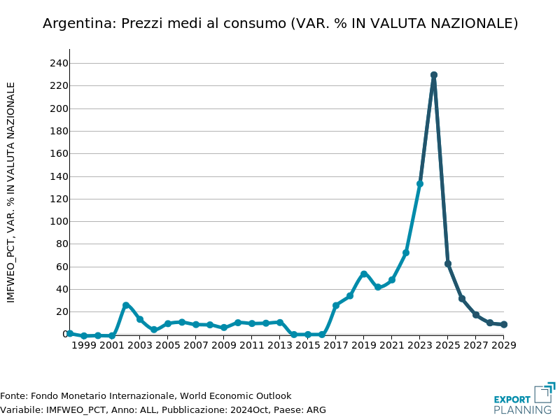 Guardando ai dati annuali, nel 2024 l’inflazione argentina ha raggiunto il picco del +230%; per l’anno in corso, il Fondo Monetario prevede un ridimensionamento a quota +63%, per proseguire poi nell’assestamento negli anni a seguire.