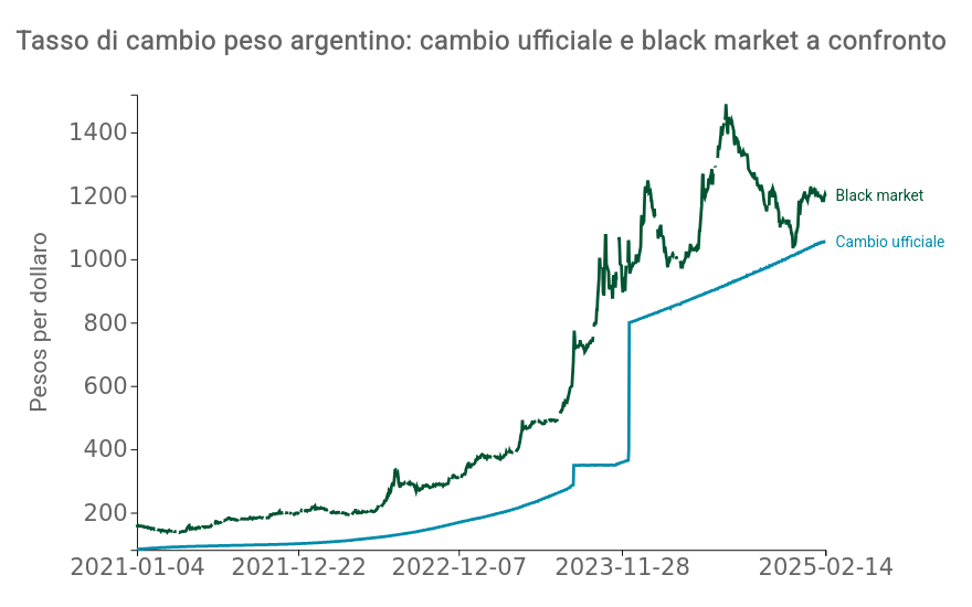 Sul fronte della valuta, con l’avvio del suo mandato, Milei ha operato una brusca svalutazione del peso (come si nota dal grafico di seguito), poi proseguita ad un ritmo mensile del 2%. A partire dal 1 febbraio 2025, il ritmo mensile di svalutazione è passato all’1%, in relazione al consolidamento osservato nel percorso dell'inflazione negli ultimi mesi e alle aspettative di un ulteriore calo.