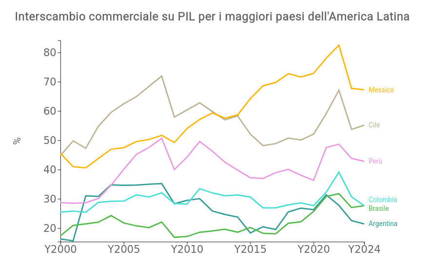 Come si nota dal grafico di seguito, l’interscambio argentino in rapporto PIL è passato, nell’ultimo ventennio, da un punto di massimo del 35%, a circa il 20% stimato per lo scorso anno. Tale rapporto si conferma quindi sui livelli più bassi rispetto ai maggiori paesi dell’America Latina.