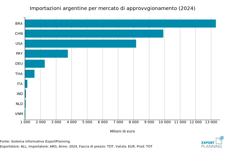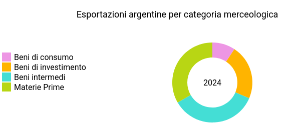 Come emerge dai numeri ExportPlanning, l’export argentino si concentra soprattutto su materie prime e beni intermedi (quasi tre quarti del totale esportato nel 2024), a fronte invece di un ruolo minoritario per beni di investimento (22%) e beni di consumo (9%). L’economia del paese è dedita infatti soprattutto sulla produzione di materie prime agricole, ma possiede anche importanti risorse minerarie; significativa, inoltre, la produzione del comparto automotive.