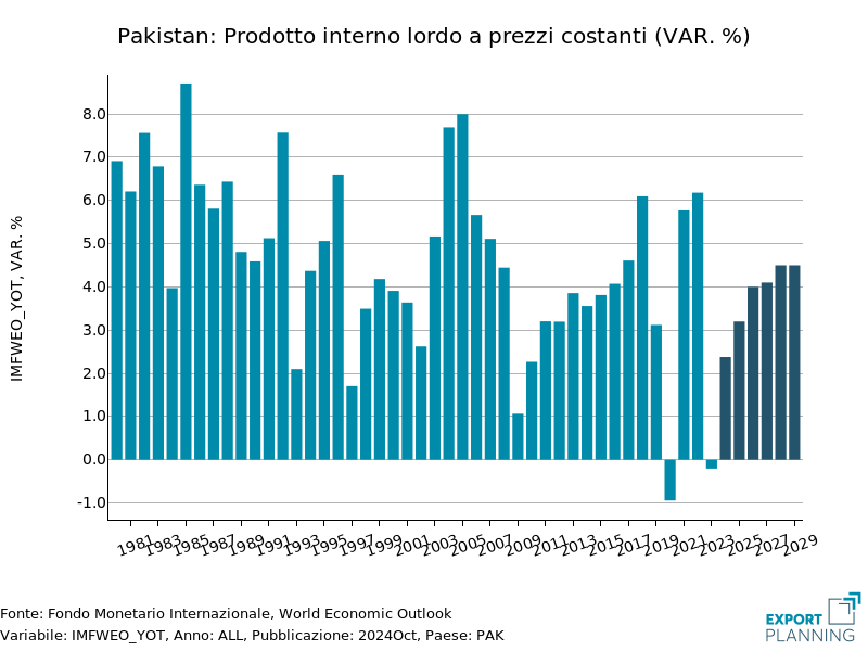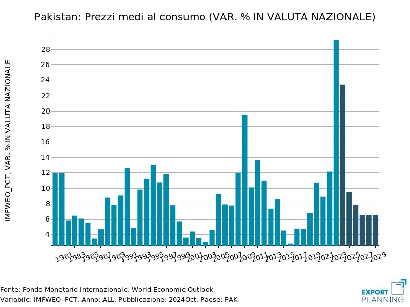 Di recente, anche significative difficoltà economiche hanno pesato sul paese: nel 2023 il PIL è entrato in territorio negativo (-0.2% secondo il Fondo Monetario), per poi recuperare nel 2024 (+2.4%), mentre l’inflazione ha raggiunto quasi il 30% nel 2023, per poi scendere al +23% nell’anno a seguire. Sono molteplici le difficoltà che hanno gravato sull’economia pakistana: ad uno scenario macroeconomico debole si è infatti unita una crisi della bilancia dei pagamenti, situazione che ha portato il paese sull’orlo del rischio default nel 2023 – pericolo poi scampato grazie ad un intervento emergenziale da parte del Fondo Monetario (FMI).