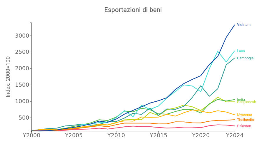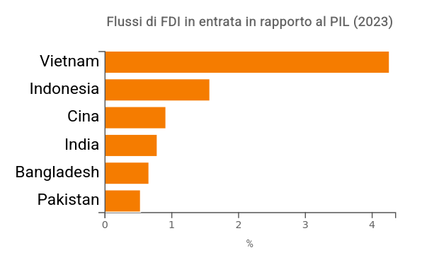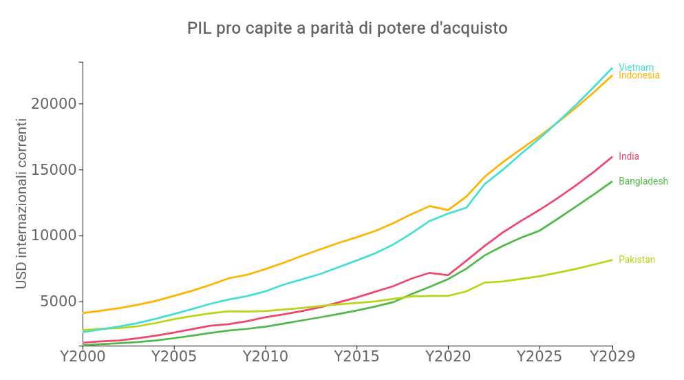 I numeri del PIL pro-capite, espresso a parità di potere d’acquisto, mostrano ad esempio una sotto-performance del PIL pakistano rispetto ai paesi vicini, come Bangladesh, Indonesia, India e Vietnam. In un contesto di decenni di dispute politiche interne, nonché livelli modesti di investimenti diretti esteri, tra il 2000 e il 2024 il PIL pro-capite pakistano è cresciuto ad un tasso medio annuo del 3.6%, a fronte di un tasso più che doppio per Bangladesh, India e Vietnam.