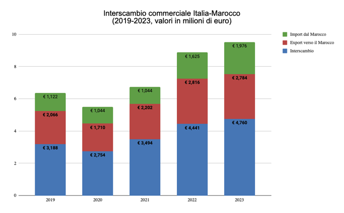 Le esportazioni italiane, pari a 2,78 miliardi nel 2023 (+29%), includono principalmente prodotti raffinati (21,6%), macchinari (15,2%) e tessili (8,8%). Le esportazioni di fosfati e derivati sono cresciute del 57,8%, mentre le importazioni di prodotti energetici hanno segnato un incremento del 51,9%. Anche gli investimenti diretti esteri (IDE) verso il Marocco sono cresciuti del 52% rispetto al 2020, una tendenza opposta rispetto al resto del Nord Africa.