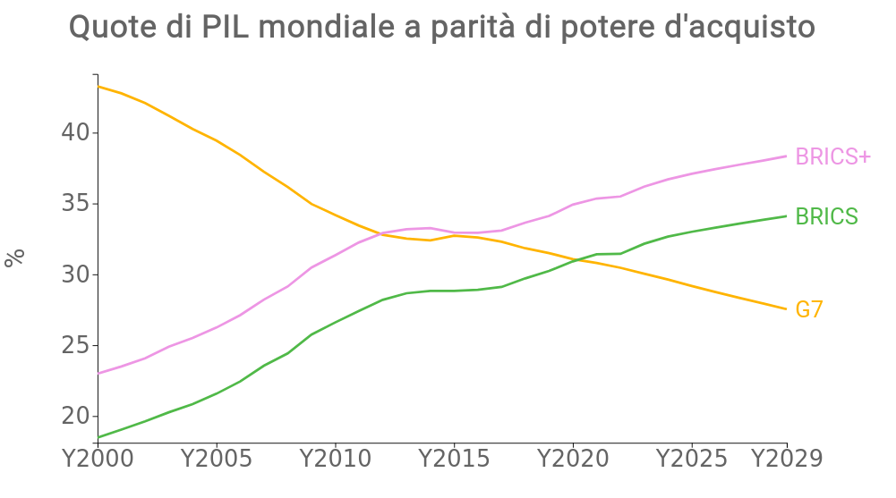 Partiamo allora dai numeri del nuovo scenario. Vantando tra i suoi fondatori i due paesi più popolosi al mondo, già prima dell’allargamento i BRICS includevano oltre il 40% della popolazione mondiale; la quota è salita al 46% con l’ampliamento a BRICS+, a fronte di un 10% per i paesi del G7 (include USA, Canada, Giappone, Germania, Francia, Italia e Gran Bretagna), secondo i dati ONU per il 2020. In salita anche la quota di PIL mondiale (considerato a parità di potere d’acquisto) prodotto dai paesi del gruppo, che risulta al momento pari al 36% secondo i dati del Fondo Monetario Internazionale per il 2023, rispetto al 30% dei paesi del G7. Come si nota nel grafico di seguito riportato, si prevede che tale tendenza possa imboccare un’ulteriore biforcazione nei prossimi anni, in relazione a tassi di crescita più dinamici per le economie dei paesi emergenti rispetto a quelle dei paesi sviluppati.