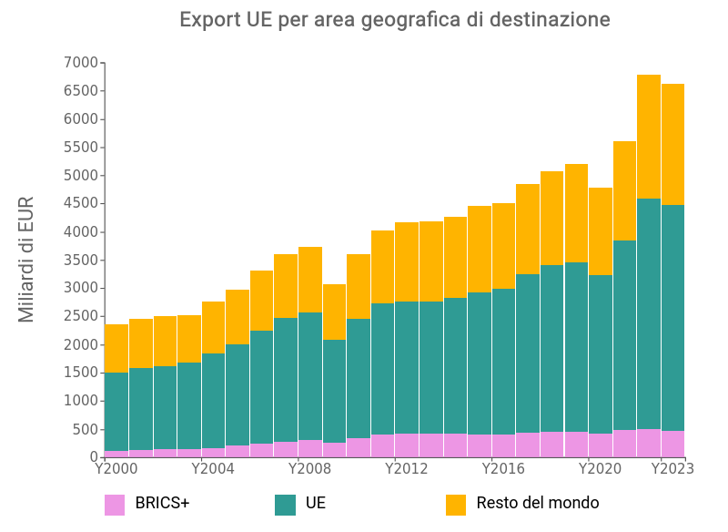 Guardando invece al quadro degli scambi commerciali con i BRICS+ dal punto di vista dei paesi UE, tanto per l’import che per l’export non emerge un ruolo determinante del gruppo per l’Unione: nel 2023, oltre il 60% delle importazioni UE di beni sono infatti venute dal suo interno, l’11.6% dall’area BRICS+ e il 27.4% dal resto del mondo; scenario simile sul fronte delle esportazioni UE, che per il 60% si sono dirette all’interno dell’Unione, per il 7% verso i BRICS+ e il 32% verso il resto del mondo.