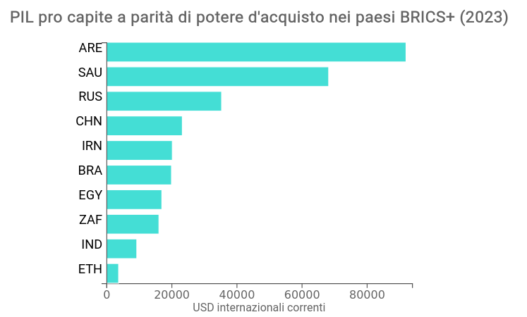 Ulteriore elemento da segnalare sul fronte del commercio estero è quello dell’interscambio nell’area BRICS+: infatti, secondo i dati ExportPlanning, se nel 2023 la quota di interscambio interno al G7 sul totale del suo interscambio col mondo è stata del 19.6%, per il gruppo BRICS+ tale quota è stata pari al 12.5%. Anche questi numeri vanno quindi a confermare l’idea di un’unione che al momento risulta più di carattere politico che operativo, votata ad accrescere il proprio peso su scala internazionale, promuovere partnership strategiche ed un multilateralismo inclusivo, in un contesto che risulta però ancora caratterizzato da significativa eterogeneità: trattasi infatti di un gruppo che differisce tanto dal punto di vista della specializzazione produttiva che dello sviluppo economico, come si nota ad esempio dai numeri del PIL pro capite dei diversi paesi membri.