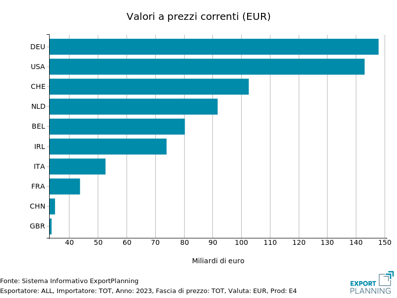 Un'analisi più dettagliata dei principali esportatori mondiali di beni nel settore healthcare, per l'anno 2023, evidenzia una serrata gara tra le principali nazioni. La Germania si posiziona come principale esportatore, con un valore di oltre 140 miliardi di euro, seguita da vicino dagli Stati Uniti, che si confermano tra i leader mondiali; più distante la Svizzera (100 miliardi) e l’Olanda (90 miliardi). L’Italia si colloca al settimo posto su scala mondiale, vantando un significativo valore di export (oltre 50 miliardi nel 2023), anche se inferiore rispetto ai principali competitor dell’Eurozona.