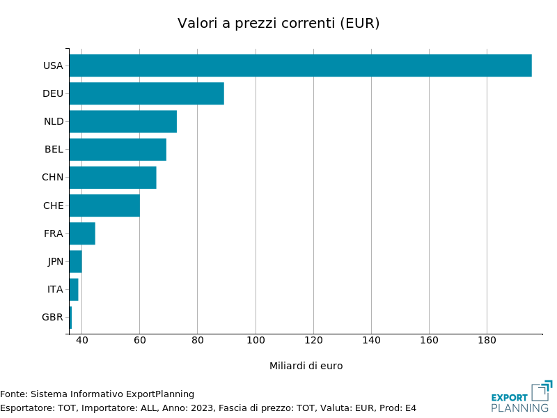 Come si nota dal grafico dei maggiori importatori, gli Stati Uniti dominano la scena e si confermano il più grande mercato di sbocco per i prodotti sanitari, mantenendo quindi, anche in termini di domanda, la loro posizione di paese leader nel settore. Nel 2023 il valore delle importazioni statunitensi è risultato prossimo ai 200 miliardi di euro, di gran lunga superiore rispetto agli altri principali mercati, come Germania, Olanda e Belgio.
