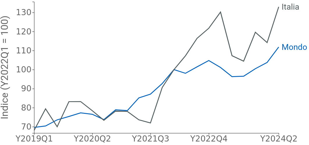 Confrontando la dinamica dell'export italiano con quella della domanda mondiale, si evidenzia come l’Italia, negli ultimi due anni e mezzo, abbia sovraperformato il mercato globale. Nella figura che segue abbiamo posto pari a 100, a fini di confronto, i livelli dell’export italiano e della domanda mondiale nel I trimestre del 2022. È evidente dal grafico la maggior crescita registrata dalle esportazioni italiane, sopratutto tra la fine del 2021 e la fine del 2022.
