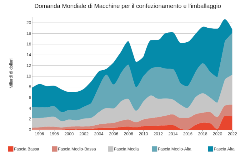 Il risultato di questi profondi cambiamenti e sfide è stato un netto rallentamento nella crescita della domanda mondiale. Nel grafico riportato di seguito, la domanda mondiale di macchine per il confezionamento e l'imballaggio, misurata in dollari, è scomposta per fasce di prezzo/qualità dei macchinari esportati.