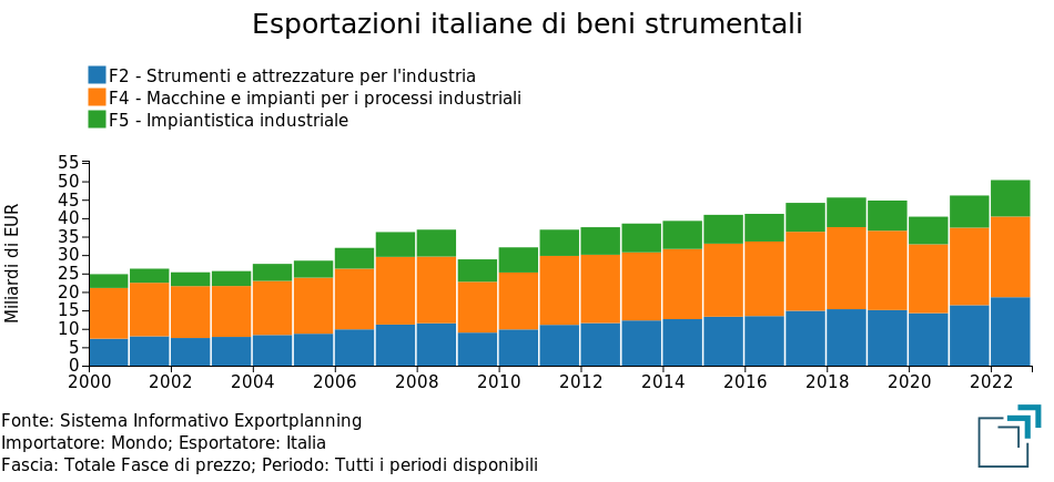 Secondo il Rapporto Ingenium 2023, realizzato da Confindustria, il punto di forza italiano sullo scenario internazionale sono i suoi beni strumentali ad elevata sofisticazione, e che in particolare si distinguono per una elevata intensità di automazione, creatività e tecnologia. Trattasi di prodotti accomunati da un elevato grado di precisione, da una presenza sempre più significativa dell’elettronica accanto alla meccanica, dall’agilità dell’impresa realizzatrice nell’adozione di eventuali personalizzazioni e nell’affiancamento di servizi alla vendita. Per questi beni, rimangono infatti spazi di opportunità sfruttabili sui mercati internazionali, tanto nei paesi emergenti (si pensi alla Cina, la Turchia e l’India) che avanzati (si pensi al principale mercato, gli USA, ma anche Francia, Germania e Canada). A tale fine, si pone quindi per le imprese italiane la sfida di riuscire a conservare il proprio vantaggio competitivo continuando ad innovare, facendo fronte alla concorrenza e confermando l’unicità del proprio prodotto sui mercati internazionali.
