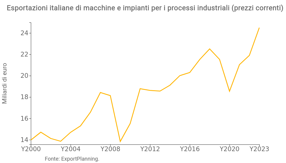 Nel 2023, le esportazioni italiane a prezzi correnti sono risultate più dinamiche rispetto ai maggiori player, a fronte di tassi più modesti per Germania (+8.6%), Cina (+2%), Olanda e Austria, e contrazioni per Giappone, Stati Uniti, Singapore, Corea del Sud e Taiwan. La domanda mondiale aveva invece registrato tassi di crescita più elevati nei due anni precedenti, a fronte di incrementi più modesti da parte dell’Italia.