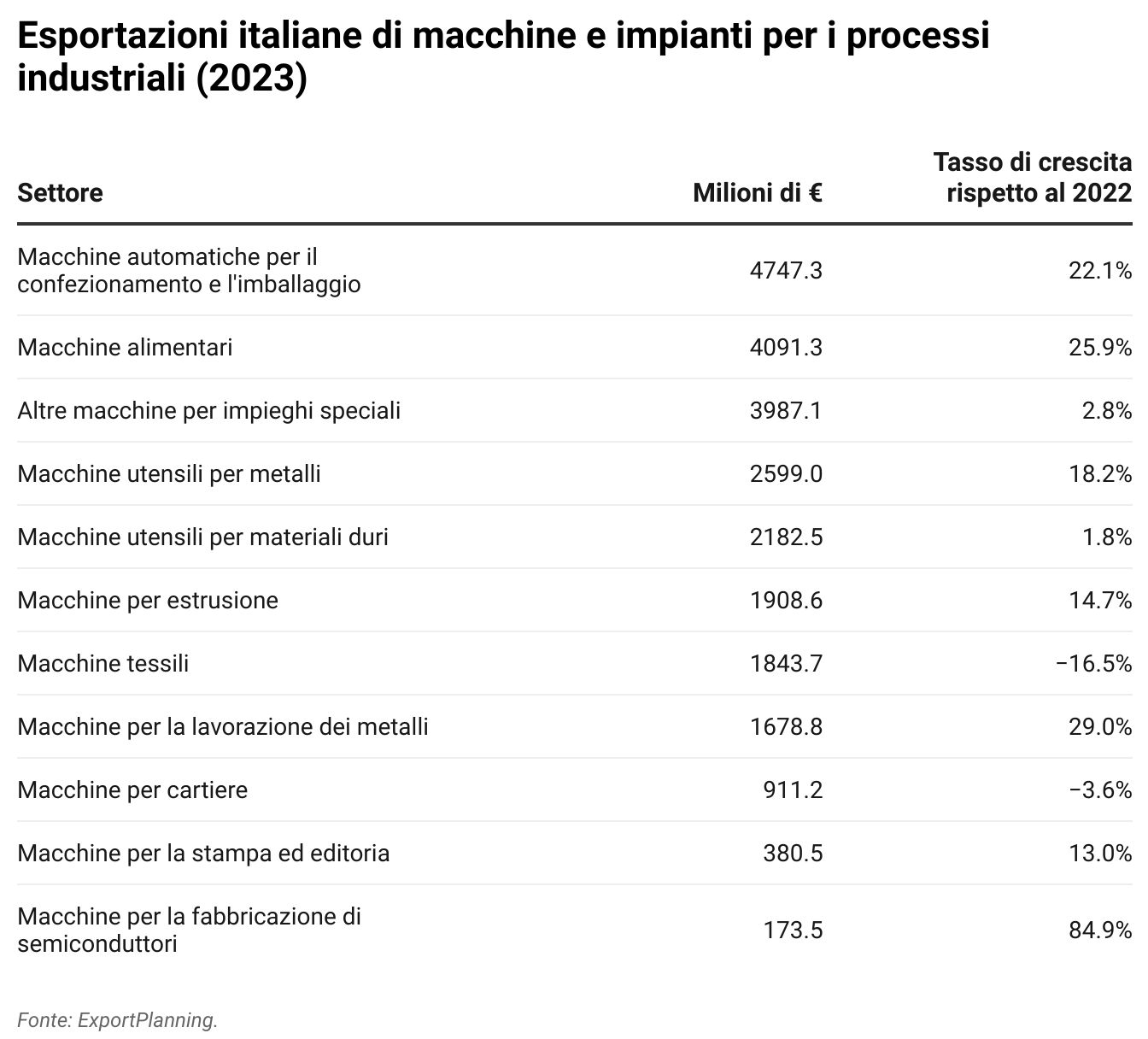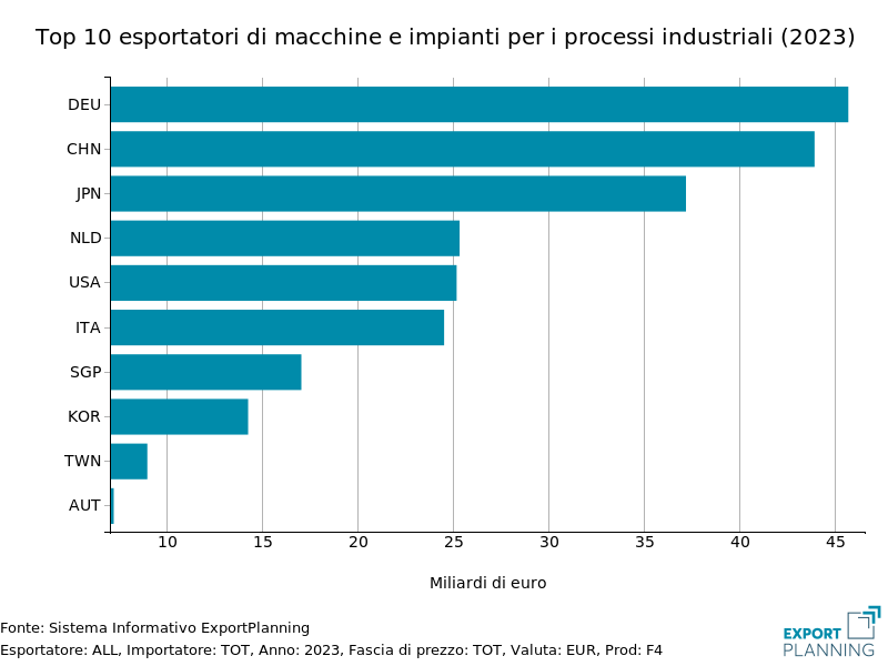 Con i suoi 25 miliardi di euro di export, l’Italia si colloca tra i 10 maggiori paesi esportatori di macchinari industriali, nello specifico in sesta posizione nel 2023, mostrando valori di poco inferiori a quelli di Olanda e USA; a dominare la classifica troviamo invece Germania e Cina (oltre 40 miliardi di euro), seguite dal Giappone.