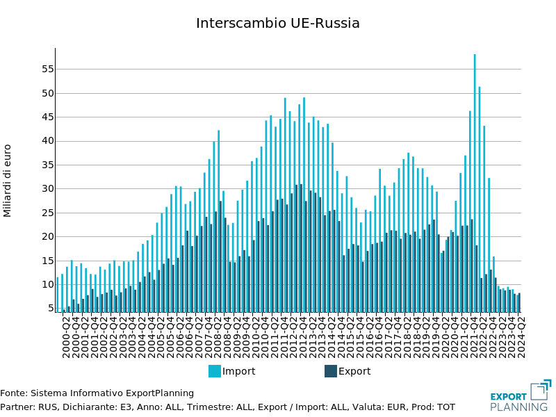 Gli ultimi dati ExportPlanning, relativi alla pre-stima del commercio UE per il secondo trimestre 2024, riportano 7.8 miliardi di import e 8.2 miliardi di euro di export da/verso la Russia, rispettivamente in calo dell’8.5% e del 19.4% rispetto allo stesso periodo del 2023.