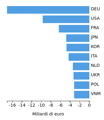 Tra i maggiori decrementi delle importazioni russe per paese di provenienza, calcolati come variazione in valore assoluto tra il 2021 e il 2023, troviamo invece l’Europa (-17.1 miliardi di euro per la Germania, -6.3 miliardi per la Francia, -4.3 miliardi per l’Italia), gli Stati Uniti (-9.7 miliardi) e i partner asiatici (con un decremento prossimo ai 5 miliardi tanto per il Giappone che la Corea del Sud).