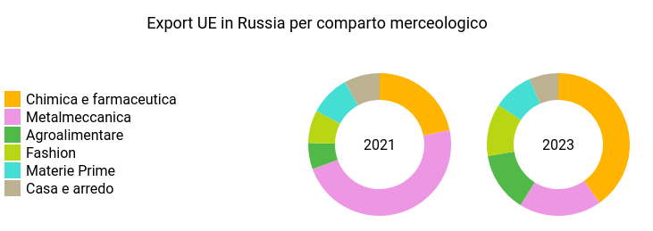 Andiamo allora a concentrarci sul caso della Russia, per esaminare come il calo dell’export UE abbia interessato i vari settori. Come si nota dai grafici a torta, emerge una chiara riorganizzazione del paniere delle esportazioni europee tra il 2021 e il 2023: il peso del comparto chimica & pharma sul totale delle esportazioni UE verso la Russia è aumentato di oltre 18 punti percentuali; in crescita di oltre 7 punti percentuali il peso dell’agroalimentare, e di oltre 4 punti percentuali il peso del comparto fashion. Stabile il comparto materie prime, a fronte di un modesto calo per il settore casa e arredo; notevole riduzione per la quota di esportazioni di metalmeccanica (pari a quasi 30 punti percentuali).