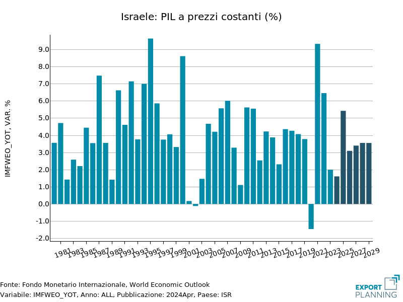 La crescita prevista per il PIL israeliano per il 2024 si è dimezzata rispetto a quanto previsto nel World Economic Outlook (WEO) dello scorso ottobre: nel WEO di aprile 2024, il Fondo Monetario Internazionale (FMI) ha infatti previsto una crescita dell’1.6% nel 2024, e poi un rimbalzo del 5.4% nel 2025.