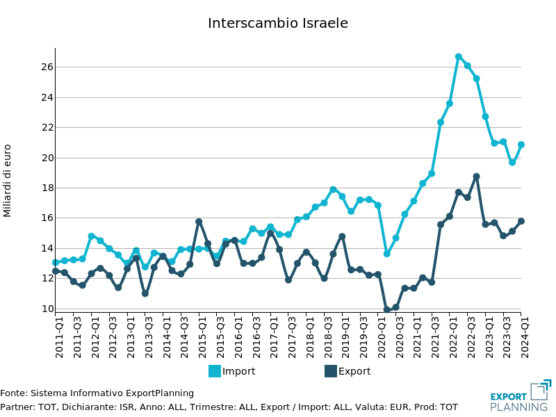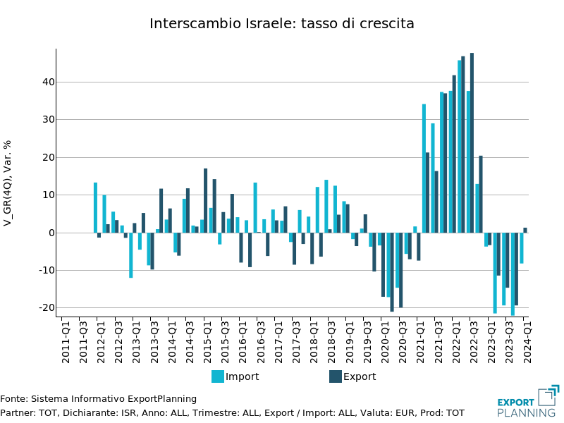 Nel contesto appena descritto, andiamo a guardare anche agli ultimi numeri per le esportazioni italiane. L’Italia risulta infatti un esportatore netto verso Israele: gli ultimi dati relativi al Q1-2024 mostrano un saldo commerciale positivo di oltre 500 milioni di euro.