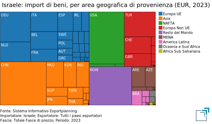 Sul fronte delle importazioni, Cina e USA dominano la classifica 2023, rispondendo ad oltre il 10% degli approvvigionamenti di Israele; il primo paese UE che troviamo nel ranking è la Germania (al terzo posto), seguita dalla Turchia. Su questo fronte anche l’Italia presenta un ruolo di rilievo, collocandosi al sesto posto tra i paesi fornitori di Israele, secondo i dati ExportPlanning. Considerando l’Unione Europea nel suo complesso, questa ha risposto a quasi un terzo delle importazioni israeliane lo scorso anno, andando a superare la quota ricoperta da Cina e USA.
