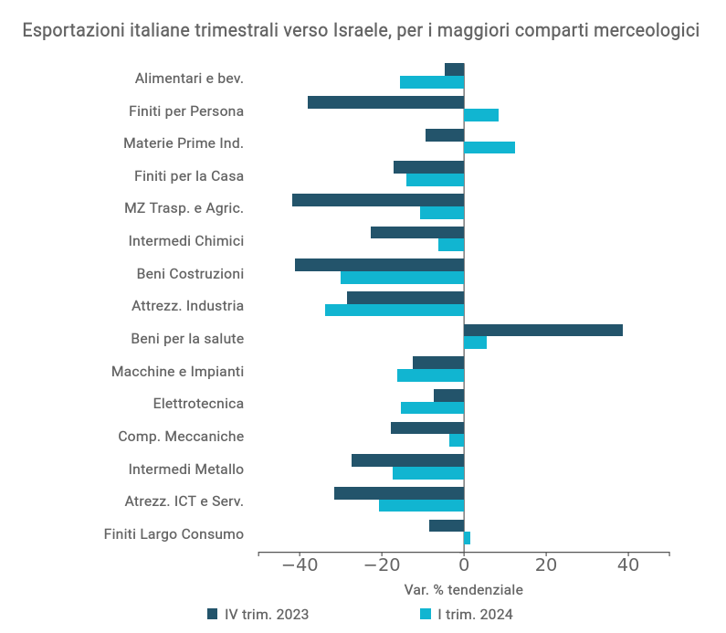 In linea con le tendenze dell’import israeliano precedentemente descritte, anche le esportazioni italiane sono entrate in negativo su base tendenziale da inizio 2023, tanto a prezzi correnti che a prezzi costanti, dopo la decisa crescita post-Covid. La contrazione tendenziale a prezzi correnti ha toccato il punto di minimo del -21% nel IV trimestre 2023, per poi tornare su livelli più moderati (-9%) nel Q1-2024.