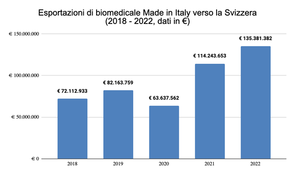Tra i Paesi più promettenti c’è la Svizzera, il cui settore MedTech è tra i principali a livello globale in quanto conta oltre 67.000 dipendenti e genera un fatturato superiore a 20 miliardi di franchi svizzeri (circa 21 miliardi di euro). Non stupisce quindi come le esportazioni italiane di apparecchi medici siano più che raddoppiate tra il 2018 e il 2022, passando da un valore di 72 mln € a 135 mln € (+105%). Numeri che solo in parte sono giustificati da una logica di rialzo dei prezzi in un contesto inflazionistico, perché anche i volumi hanno fatto registrare una performance da +87% in soli 4 anni.