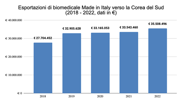 La Corea del Sud è riconosciuta come uno dei Paesi più dinamici nel settore delle biotecnologie e del biomedicale, grazie ad un processo intrapreso da diversi anni che ha abbinato ricerca scientifica e sviluppo di iniziative industriali pubbliche e private. D’altra parte, il comparto rappresenta la quinta voce dell’interscambio tra Italia e Corea, e il trend sembra poter continuare anche negli anni a venire: mentre l’export in volumi ha fatto segnare un +25% tra 2018 e 2022, i valori sono passati dai 27,7 mln € del 2018 ai 35,5 mln € del 2022.