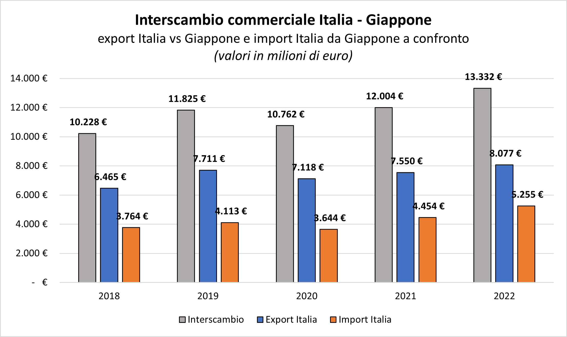 L’ormai solida apertura dell’economia nipponica agli scambi mondiali, e in particolar modo a quelli dei Paesi europei, fanno del Giappone un partner privilegiato per l’Italia. L’Accordo di Partenariato Economico tra l’Unione Europea ed il Giappone (EPA), in vigore dal 1° febbraio 2019, ha abolito i dazi per il 90% delle esportazioni UE, prevedendo per alcuni prodotti la graduale eliminazione delle tariffe secondo precise scadenze annuali. L’accordo ha rappresentato un vero e proprio volano per le nostre esportazioni: dall’entrata in vigore, il valore dell’interscambio commerciale tra le due Nazioni è cresciuto del 13%, superando ampiamente i € 13 miliardi nel 2022. E assume particolare rilevanza l’ampio avanzo a favore della Penisola: tra il 2018 e il 2022, le esportazioni italiane sono sempre state superiori alle importazioni dal Giappone, con uno scarto di oltre 2,8 miliardi nel 2022, a dimostrazione del forte interesse da parte del Sol Levante per i prodotti Made in Italy. Senza dimenticare che l’Italia ha rappresentato l’1,31% della quota totale di mercato del Giappone, il secondo Paese europeo in assoluto dietro alla Germania, responsabile del 2,54% del mercato nipponico.