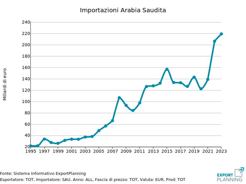Secondo i dati ExportPlanning, nel 2022 l’italia si è collocata all’11esimo posto tra i paesi fornitori dell’Arabia Saudita, e al terzo posto tra i paesi UE, preceduta da Germania e Olanda; considerando l’Unione nel suo complesso, allo stato attuale questa risulta il secondo maggiore fornitore dell’Arabia Saudita, alle spalle della sola Cina.