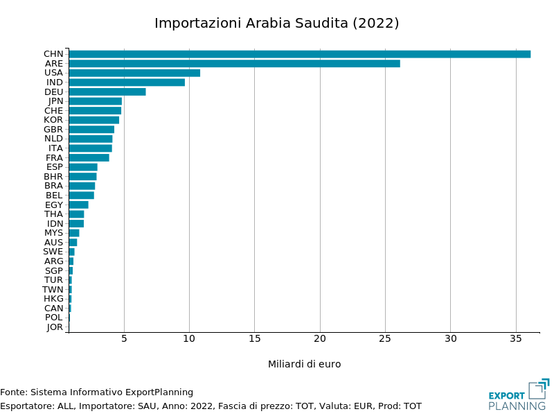 Tra i paesi fornitori del mercato saudita troviamo in prima posizione la Cina, da cui sono provenute più del 15% delle importazioni del paese nel 2022, pari a 36 miliardi di euro; seguono i vicini Emirati Arabi (oltre il 10%, pari a 26 miliardi di euro), gli Stati Uniti e l’India (attorno ai 10 miliardi di euro).