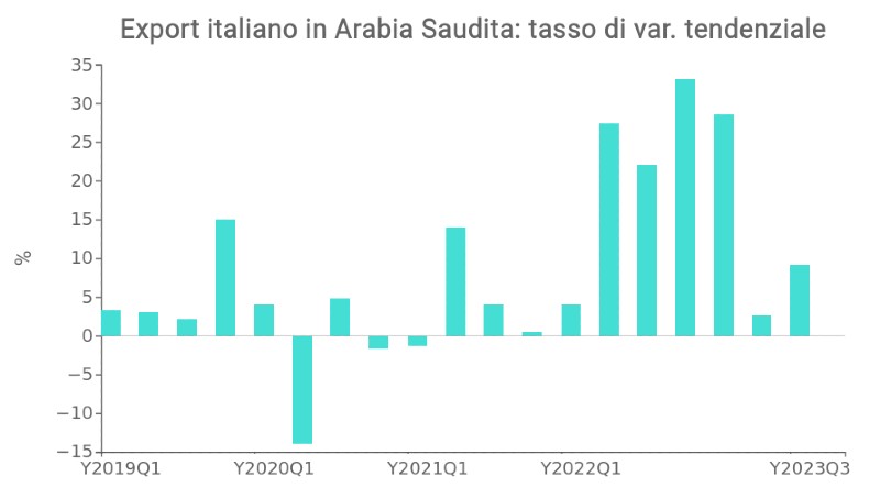 Secondo l’ultimo update del Rapporto Export SACE 2023, rilasciato nel mese di dicembre, in Medio Oriente i paesi del Golfo si confermano come destinazioni principali per le esportazioni italiane, grazie ai piani di sviluppo in atto nella regione. In particolare, in Arabia Saudita è proprio il processo di diversificazione economica, i progetti infrastrutturali e immobiliari e la volontà di investire nella decarbonizzazione che potranno fornire le maggiori opportunità per le imprese italiane.