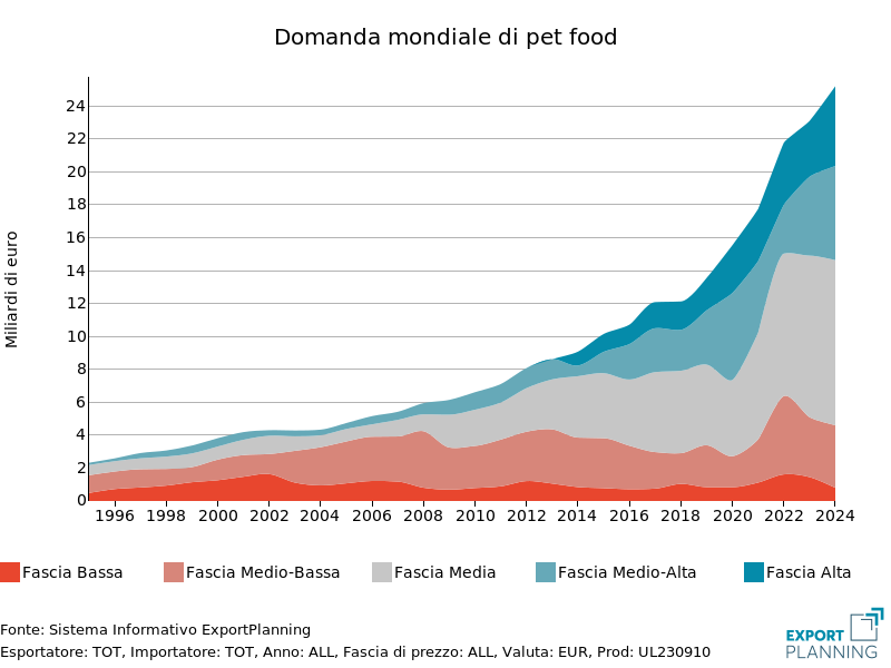 Guardando all’evoluzione degli scambi mondiali del settore negli ultimi decenni, si riscontra una evidente crescita di lungo periodo, e la progressiva formazione di una fetta di mercato premium (fascia alta e medio-alta di prezzo). La “premiumizzazione” dei prodotti testimonia la crescita della cultura dell’animale da compagnia, nonché l’offerta di sempre più beni e servizi ad hoc per la sua cura.