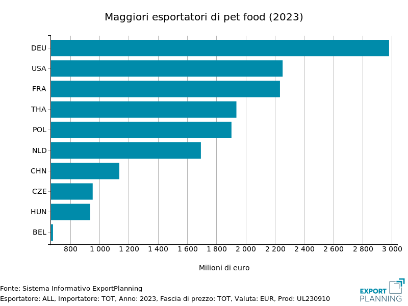 Guardiamo ora agli esportatori. Anche le esportazioni di alimenti per animali da compagnia sono soprattutto in mano ai paesi sviluppati, in primis Germania (quasi 3 miliardi di euro nel 2023) e USA (oltre 2.2 miliardi), che vantano in entrambi i casi un saldo commerciale positivo. In termini di produzione, sono invece gli Stati Uniti a vantare il primato globale, segnalando quindi come buona parte della sua produzione si rivolga verso il mercato interno, il più ampio al mondo.