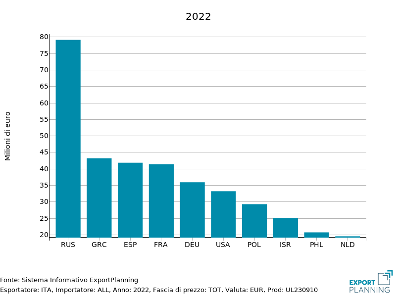L’Italia, dal canto suo, si è collocata nel 2023 in undicesima posizione tra i maggiori esportatori del settore, superando la soglia dei 670 milioni di euro; si prevede un’ulteriore crescita per il 2024, che dovrebbe condurre in prossimità dei 700 milioni.