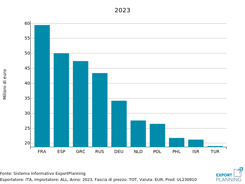 Lo scorso anno, oltre il 55% delle nostre esportazioni si sono dirette verso il mercato europeo: parliamo in particolare di Francia (quasi 60 milioni di euro), Spagna e Grecia (attorno ai 50 milioni).
