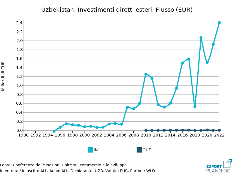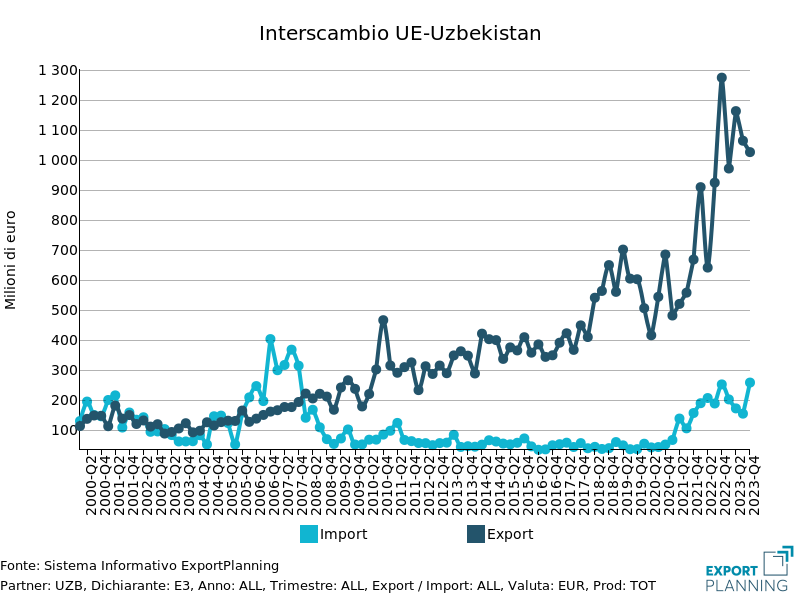 Le prospettive derivanti dai rapporti con il Paese sono percepite, in un’ottica di lungo periodo, anche sul fronte UE: un primo Partnership and Cooperation Agreement tra l’UE e Uzbekistan è in vigore dal 1999, per costituire le basi di una relazione più ampia, dando spazio tanto al dialogo politico che alle opportunità di business e investimento. Nel 2021 l’Uzbekistan è stato inoltre accettato dall’UE come beneficiario del sistema di preferenze generalizzate Plus (SPG +): tale progetto implica l’applicazione di tariffe preferenziali per i prodotti importati dall'Uzbekistan, con l’obiettivo di sostenere la promozione dello sviluppo sostenibile e del buon governo. Si sono inoltre concluse a luglio 2022 le negoziazioni per un accordo rafforzato (Enhanced Partnership and Cooperation Agreement), che mira ad una progressiva evoluzione delle relazioni, estendendole a nuovi settori di cooperazione, e migliorando in modo significativo il relativo quadro normativo, nell’ottica di una crescente cooperazione nel prossimo futuro.