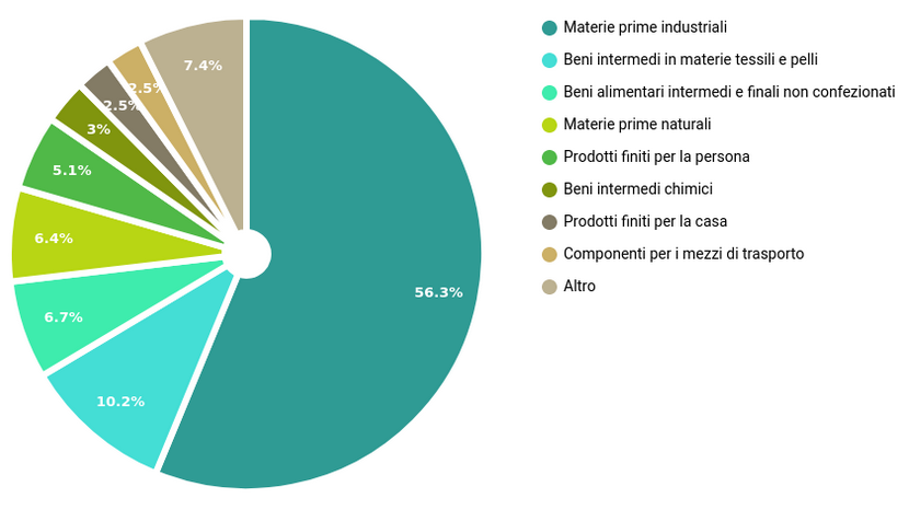 In termini di produzione di oro, nel 2022 il paese si è collocato in decima posizione su scala mondiale. Come si nota dal grafico a torta, troviamo al secondo posto per l’export uzbeko i beni intermedi in materie tessili e pelli: in particolare, il paese è specializzato nell’export di filati di cotone, godendo di un buon posizionamento a livello mondiale.