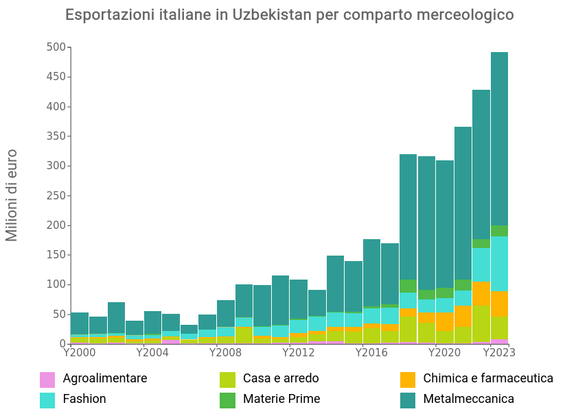 I dati delle importazioni uzbeke dall'Italia confermano la volontà di una diversificazione settoriale. In questo senso, è soprattutto l’export del comparto macchinari e impianti che presenta buone prospettive per gli esportatori italiani, per alimentare un tessuto industriale proiettato all’innovazione e alla crescita. Nell'ambito della metalmeccanica, nel 2023 i comparti italiani che hanno mostrato i maggiori incrementi in termini di variazione percentuale dell’export verso l’Uzbekistan sono stati l’elettrotecnica, le componenti meccaniche e ottiche, i beni intermedi in metallo e l’impiantistica industriale.